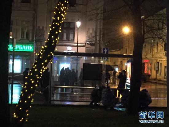12月7日,在俄罗斯首都莫斯科,警察在发生爆炸的公车站警戒。当日,莫斯科市中心一处公车站发生爆炸,造成3人受伤。 新华社记者鲁金博/摄