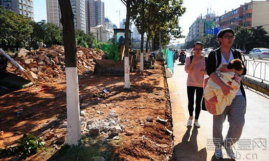 11月24日,西山区铲除盘龙江沿岸1.7公里长绿化带以建江景跑道。江洋/摄