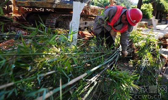绿化带拆除后,工人把活着的竹子打包带走。江洋/摄