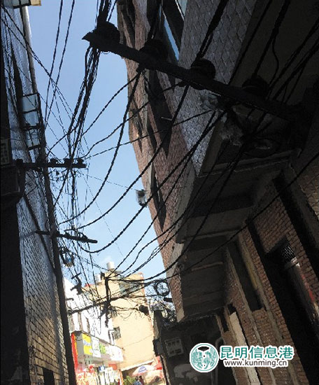 随后,记者在西山区船房村也发现了类似的现象,村内高层居民楼的间距只有1米多宽,很多电线都搭在这段狭小的空间内,上下左右交错,仿佛一张“天网”。有些线路因为没有固定好,掉落下来后触手可及。