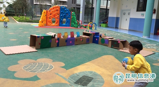 西山区培奇全纳幼儿园近日刚刚被认定为云南省第九批绿色学校,作为孩子们接受行为启蒙教育的第一步,幼儿园十分重视对孩子们环保行为习惯的养成和培养。园内干净整洁,地上没有一点儿垃圾,小朋友们穿梭在用废旧纸板搭建成的“时光隧道”里做游戏。此外,废旧纸团、饮料盒子在老师们的巧手制作下,都摇身一变,成了孩子们心爱的玩具。