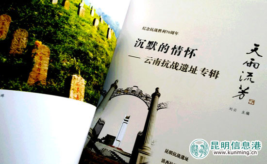 据省文物局的统计,云南省级的抗战文物达140多处。 为响应习近平总书记“深入开展中国人民抗日战争研究,加强史料收集和整理,让历史说话,用史实发言。加强抗战遗迹保护开发,发挥各类抗战纪念设施作用,为开展抗战研究、展示研究成果、进行爱国主义教育提供阵地。”的要求,云南文投集团、昆明市政协、滇西抗战历史文化研究会、云南创意文化产业投资有限公司、《天雨流芳》编辑部共同策划编辑,云南人民出版社出版的首部反映云南抗战遗址专辑《沉默的情怀·云南抗战遗址》正式出版发行。该书是云南省纪念世界反法西斯战争胜利及抗战胜利70周年收官之作,这爱国情怀,就是诗人的一首歌。