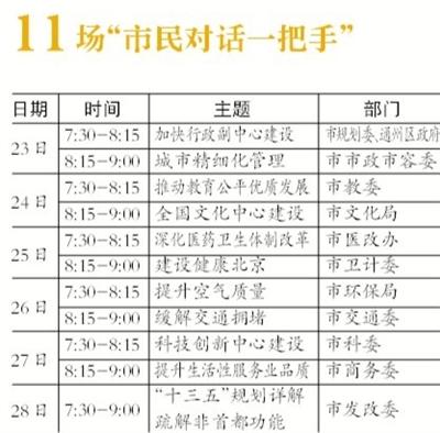 1月23日至1月28日早上7时30分至9时,市发改委、市环保局、市交通委等12家政府部门的“一把手”还将走进北京电视台位于北京“两会”现场的演播厅,通过电波、视频、网络、客户端等多种形式,就“十三五”规划、行政副中心建设等热点话题,与市民进行对话沟通。
