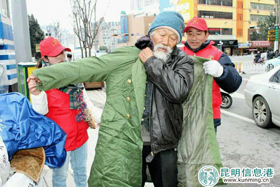 雪花飘落,龟背立交下卷缩着两位流浪者,志愿者赶紧拿两件棉大衣给他们穿上,系好扣子。志愿者看见立交桥公交车站旁一位乞讨者冻得打哆嗦,又赶紧给他穿上一件。 在圆通山动物园路边,发现了一位头发胡子花白的流浪者,顾中国赶紧拿一件棉大衣给老人穿上,流浪者激动地连声道谢。 “海洋之星”捐的那件棉衣发给你了一个没穿大衣的老大妈。志愿者沿着翠湖、圆通街、青年路、人民路、正义路、南屏街边走边寻找流浪者。