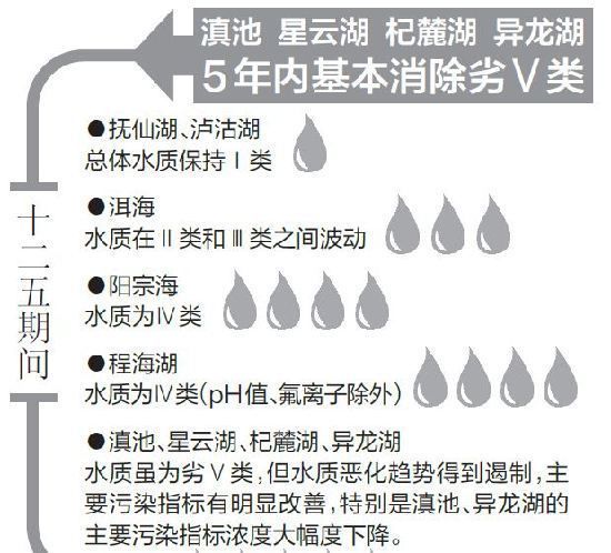 滇池、洱海等九大高原湖泊的水质一直饱受关注。省人大代表、省环保厅厅长张纪华透露,“十三五”期间,滇池、星云湖、杞麓湖、异龙湖四大高原湖泊,要基本消除“劣Ⅴ类”(个别指标除外),抚仙湖和泸沽湖要保持Ⅰ类水质,洱海、程海、阳宗海水质要保持稳中向好。