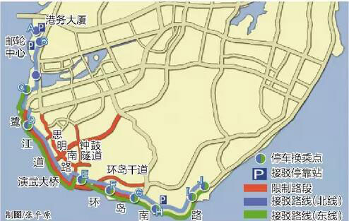 厦门在“东渡国际邮轮码头——湖滨西路——鹭江道——环岛路——曾厝垵”一线,开通了往返的旅游直通车以及公交旅游专线,市民和游客可以通过手机导航软件或相关APP软件查询线路和停车场位置。