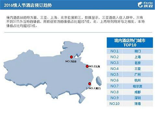 境内酒店目的地方面,三亚、上海、北京位居前三。数据显示,三亚酒店入住人群中,只有不到30%为当地的情侣,而前往旅游的情侣占比超过7成,北、上两地则刚好与之相反,本地情侣占比均超过5成;选择入住境内高星级(4-5星)酒店的情侣占比为62.3%,远高于去年。