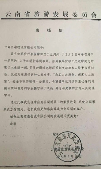 2月16日,云南空港物流有限公司收到一封来自云南省旅游发展委员会的感谢信。信中感谢了云南空港物流有限公司行李保障部凌霄班组的王周兴“拾金不昧、高风亮节”的精神。