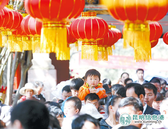 老昆明人从年三十起到正月十五都要吃用芹菜、白菜、青蒜、萝卜等配以肥肉、火腿煮成的“长年菜”,家家喜食饵块,从炒到煮,从甜到咸,也要吃到正月十五才罢休。旧时老昆明庙会之多,从正月到十二月,几乎月月都有,真是令人叹为观止。正月初九的金殿庙会则是一年中第一场庙会:鸣凤山上满山都是人,卖吃食、物品的摊点遍山可见。到了元宵这天,昆明人还要外出看灯,“城内于三牌坊,城外于通济桥西、忠爱坊南,皆灯市。”