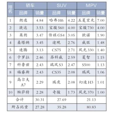 数据显示,乘用车生产214.84万辆,环比下降7.44%,同比增长9%;销售222.87万辆,环比下降8.74%,同比增长9.27%。商用车生产30.36万辆,环比下降9.32%,同比下降4.42%;销售27.19万辆,环比下降20.83%,同比下降3.46%。与此同时,SUV车型延续了2015年的火爆态势,共销售78.49万辆,同比增长达到60.51%。而轿车和交叉型乘用车1月销量则环比、同比双双下降。