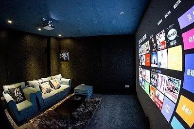 他们选择了中包的房间,88元钱可以看两个小时的电影,张思付选择了动画片和女儿一起看。“要是好几个人一起来的话,我觉得价格还是能接受的,去电影院也差不多的价格。”走进房间,灯光并不明亮,四面墙壁顶部有一些小灯,一面墙被用作了投影的屏幕,从选择影片到播放都可以直接在投影上呈现。另外三面墙壁主要以暗色为主,配上深蓝色的沙发,和大影院的感觉很类似。茶几和风扇、坐垫和靠枕,这些小物件又让人感觉像是在家里一样。