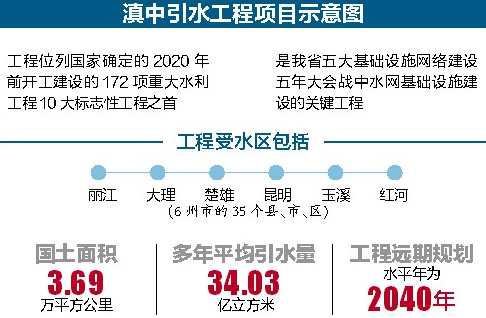 去年9月,滇中引水工程勘察试验性工程动工。按照计划,滇中引水工程将在今年6月全面动工。工程总工期为96个月。滇中引水工程由水源工程和输水工程组成。水源工程位于丽江市石鼓镇,从金沙江无坝引水,设计引水流量135立方米每秒,共安装12台机组,总装机492兆瓦,最大提水扬程约218米。输水工程自丽江石鼓望城坡起,经大理、楚雄、昆明、玉溪、红河,终点为红河新坡背,全长661公里。