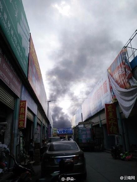 3月13日,昆明市昌宏路高原明珠五金机电城内一个仓库着火,已经烧了半个小时,浓烟较大,目前119消防车已经到达现场。图片来自网友@古滇螳螂传谋 @-萨朵-(春城晚报)
