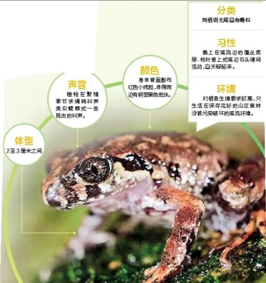 腾冲掌突蟾还有一个特点,就是雄蛙在繁殖季节的求偶鸣叫声,非常类似于蟋蟀或一些昆虫的叫声。在四五月的繁殖季节,溪流边能听到很多这样的叫声。夜间考察时,考察队员一度在溪流灌丛里根据叫声去寻“青蛙”,同行护林员向导则坚称这只是一些虫子叫,最终考察队员把“蛙”找了出来,向导大吃一惊。