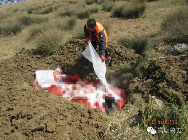 图为:销毁死因不明,未经检疫合格的冰冻肉