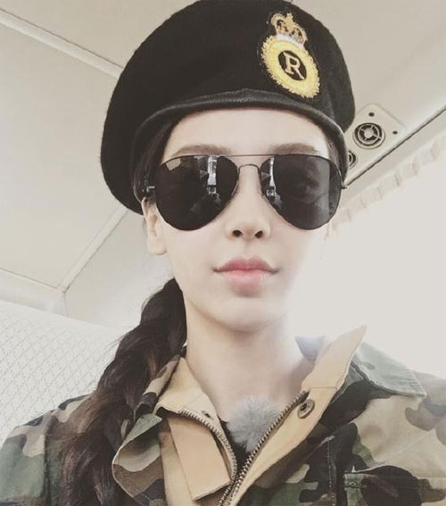 20日,Angelababy在微博贴出一张自拍照,只见她穿着迷彩军装和黑色军帽,将一头亮丽的秀发绑成俐落的辫子头,再戴上酷劲十足的黑色飞行墨镜,帅气的模样马上就让人联想到,最近的热剧《太阳的后裔》中的宋仲基,而她似乎也是该剧的粉丝,模仿男方在剧中的口气说话,立刻让粉丝笑成一片。