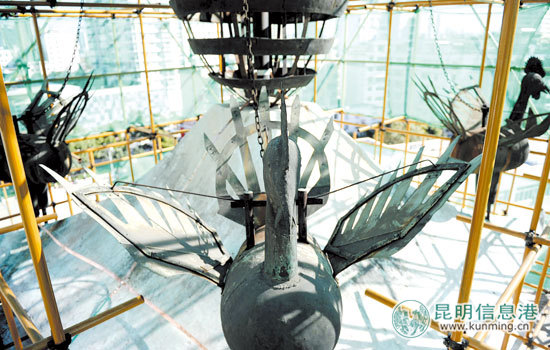 彼时昆明多水患,百姓都疑心是龙作祟,世传龙性敬塔而畏鹏,故选址建塔,并用以龙为食的迦楼罗镇之。据老一辈的昆明人说,在早以前“金鸡”还会鸣叫,这一点得到了文管所工作人员的证实。原来迦楼罗口中有风哨,每当三四月刮西南季风,便能吹响风哨。“风哨响也预示当年雨量会比较丰沛,也提醒大家注意防洪防涝。只是年代久远,风哨受到损坏,加上天气预报方法越来越科学,风哨预测也就渐渐失去了意义。”