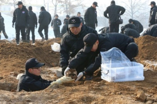 韩方人员在收集中国志愿军遗骸