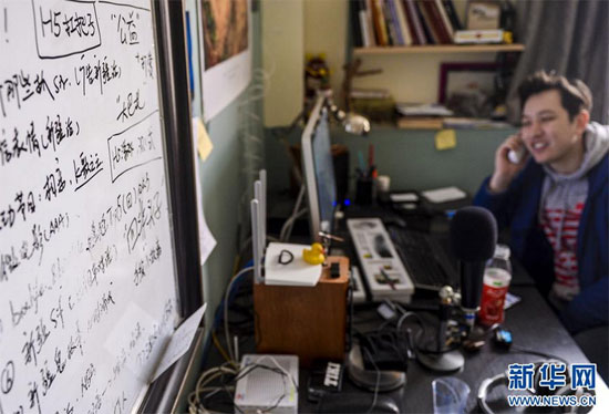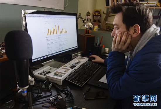 2016年3月30日,乌鲁木齐,在“XJ土话大百科”工作室内,达尼亚尔在电脑上查看自媒体“粉丝”活跃度。