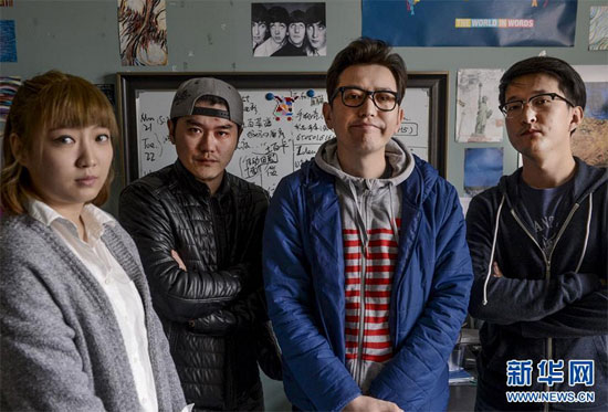 达尼亚尔(左)与团队主创人员呼尔察为搞笑视频配音