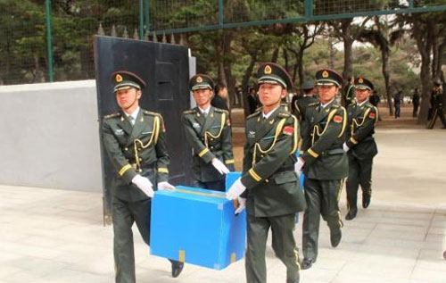 3月31日,辽宁沈阳,礼兵护送烈士遗骸及遗物至临时安放处。当日13时许,第三批36具在韩国的中国志愿军烈士遗骸运抵沈阳抗美援朝烈士陵园。此前,韩方已向中方移交505具中国军人遗骸。中新社记者 孙昊声 摄