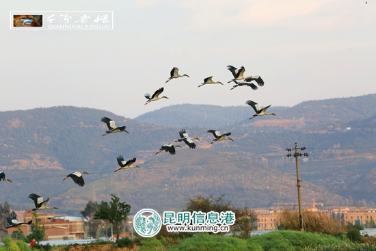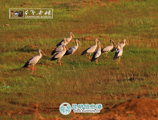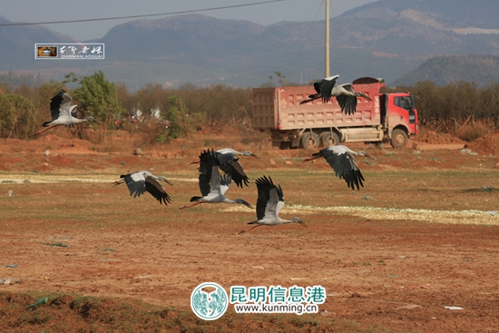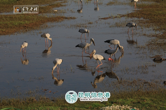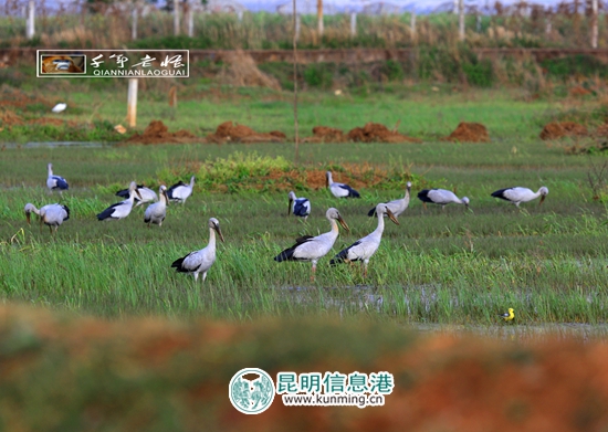 昆明信息港讯 通讯员李继明 4月10日,云南野鸟会会员在晋宁县发现20只钳嘴鹳在湿地觅食,本次发现是继2013年首次在晋宁东大河发现12只后又再次发现该鸟。