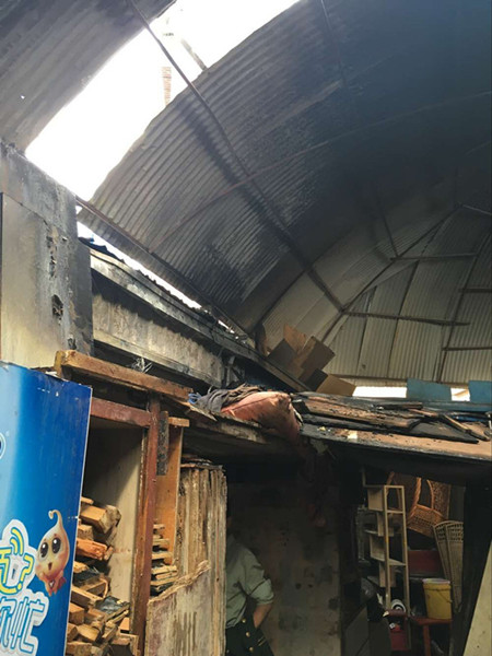 原来,是七排最里面的一个旧电器商铺起火。而起火商铺老板并不在店内,店门紧闭。