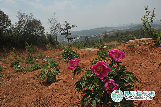 据了解,该公司主要定位是建成山地马拉松全民健身运动公园、濒危物种育苗基地等。为达到这一建设目标,公司正着力于4400 亩两面寺都市生态庄园的建设,目前已投资2亿多元对其中的1068 亩采石场进行了植被修复,并已通过验收。去年11月开始依其地势山形建成的油用牡丹基地和观赏牡丹园面积分别为125亩和100亩,其中观赏牡丹园种植从山东菏泽引进白、红、粉、紫等 9 大色系的观赏牡丹和芍药 152 个品种,此外还种植了 17 株来自山东菏泽、树龄在百年以上大规格牡丹。“这里是目前昆明地区规模最大、品种最多的牡丹观赏园,种植的观赏牡丹和芍药都是成龄苗,因此今年3月底就先后开花。 因为品种不同,现在牡丹花基本都凋谢了,只有一些晚花的黄色系牡丹仍在开花。”负责牡丹种植项目的杨永根说。