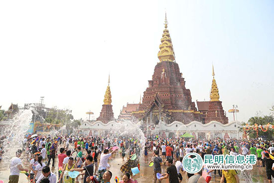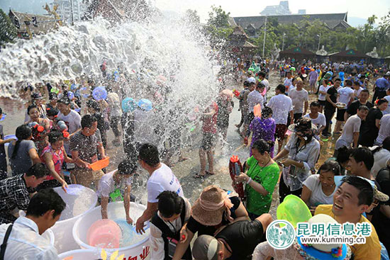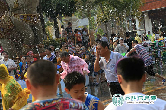昆明信息港讯 记者王莹 15日,数万当地居民和外地游客齐聚景洪,相互泼水,互祝吉祥、幸福、健康,共度泼水狂欢节。