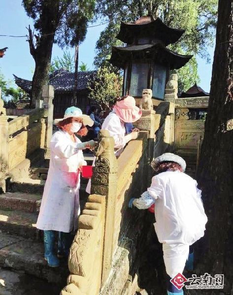 据介绍,须弥座主要由各类沙石砌成,其中以红砂石最容易氧化,为做好此次修缮工作,金殿名胜区和云南省文物考古研究所均投入大量专业人员,首先对须弥座表面氧化的部分进行清除,之后再喷洒一层既能将石质表面的微生物杀死、防潮防霉,还能填充裂开的沙石裂缝的特殊药物。