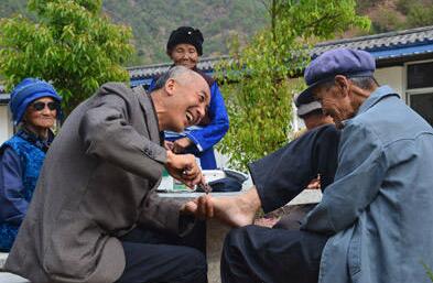 2015年4月25日,李桂科在山石屏给康复者老人们剪指甲。苏鹰 摄