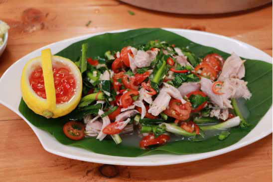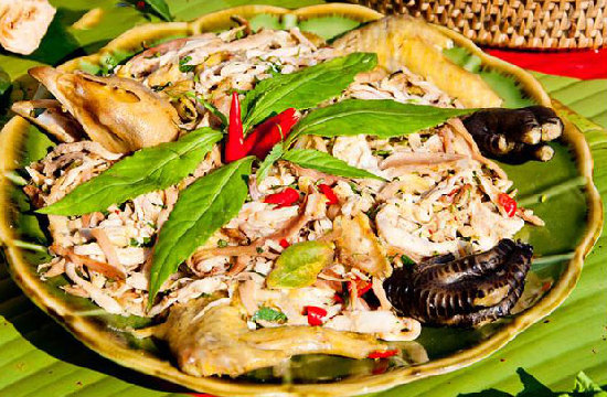 鬼鸡是景颇族的一道传统美食,当地有用鸡祭鬼神的习惯,祭完鬼神后,取鸡肉撕碎,加小米辣、芫荽、柠檬等一起在野外拌食,自然的柠檬香和芫荽之清新融入鸡肉,酸香醒胃,加上姜蒜与辣椒释放出的复合辣味,别有一翻原始风情,让人一口接上一口,欲罢不能。为了能常常吃到这道美味,聪明的景颇族人将“鬼鸡”端上了饭桌,并作为款待客人的上好佳肴。