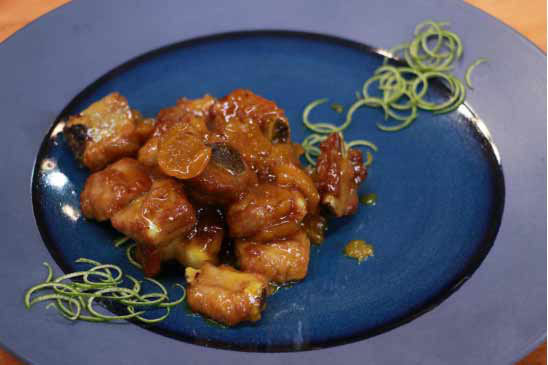 材料:排骨 姜 葱 雕梅 青柠檬 黄饭花水 冰糖 吉士粉 盐