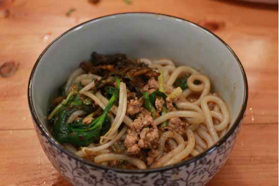 对一个云南人来说,吃完了鬼鸡,总觉得还是缺点儿什么,这不,雷裴然又麻利地做了一碗小锅米线。铮亮的铜锅用水洗过之后,放在大火上,加入高汤,先放韭菜煮一下,再放入米线、鲜肉等,而且小锅米线一定是一锅一锅煮的,煮完马上吃,否则面会糊掉。米线里一定少不了两样佐料,一样是酸腌菜,其实就是盖菜,不仅茎叶脆嫩,口味清香,而且含有丰富的蛋白质,维生素和矿物质;另一样是昭通酱,色泽棕红,鲜艳油润,酱香浓郁,麻辣咸香,堪称云南省的“酱类之冠”。