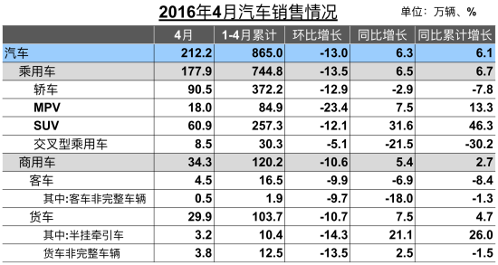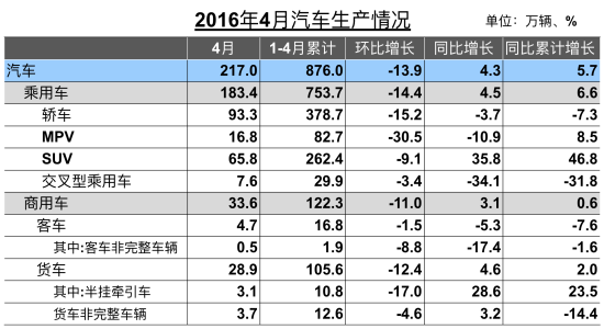 2016年4月,汽车生产217万辆,环比下降13.91%,同比增长4.25%;销售212.24万辆,环比下降13.01%,同比增长6.32%。
