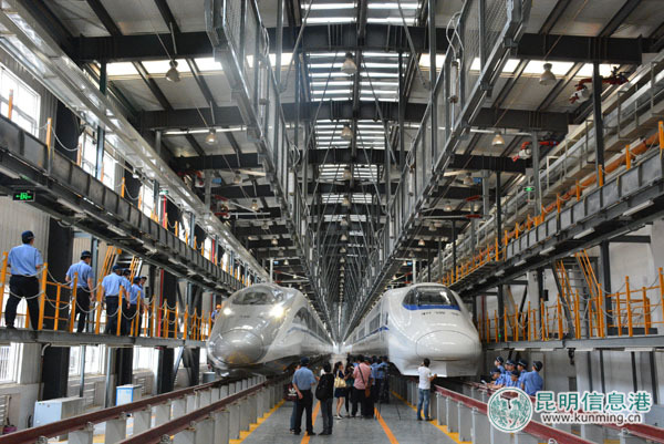 CRH380A及CRH2A高铁动车组停放在"动车小窝"——昆明西动车检查库中。记者孙瑞婷/摄