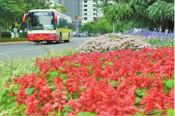 同时,还在正义路设置4个立体花钵,一二一大街、华山西路、人民中路、龟背立交桥设置44组花塔造型。花卉品种有:孔雀草、一串红、比格海棠、万寿菊、五色草、鼠尾草、四季海棠、洋凤仙、垂吊矮牵牛等,这些花卉使道路景观更加色彩缤纷。