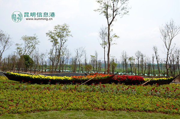 在环湖东路(外侧),草地上,一群“海鸥”正缓缓飞来。流线波纹的彩色植物带与海鸥模纹的结合,打造出了特色景观“浩波鸥集”,突出昆明四季如春、海鸥云集的城市特色。而名为“古渡渔灯”的主题造型花坛以植物造景为主,通过立体花船和波浪绿植,展现官渡区的历史文化,与原地形缓坡结合,形成色彩多样、层次多变的景观。