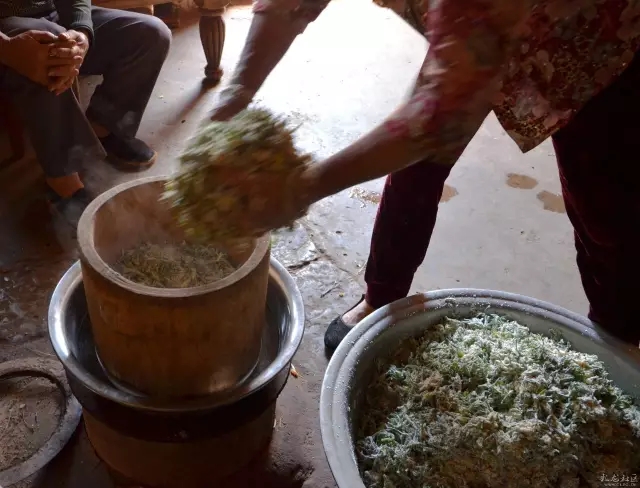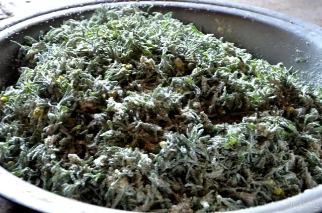 采撷那豆田里的面蒿,要选好时机,就是绿油油的豆苗长势最旺盛的时候,也正是面蒿最肥嫩的时候。趁面蒿刚打苞、还没有开花时就采撷好,剔去底部的梗与叶片,专门留下嫩绒绒的,洗净晾会,然后准备配料:选用上好的糯米水磨掉酱面泡发,然后将鲜嫩的面蒿和糯米掉酱面放在石臼里舂,舂得细细的,舂的过程中,还要用勺子之类的物件在石臼里翻,把面蒿和糯米掉酱面搅拌均匀了。