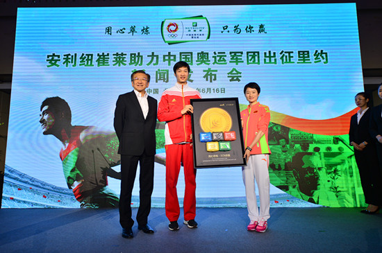 中国奥委会市场开发部李桦主任、王明晏副主任、安利(中国)总裁黄德荫、奥运冠军雷声、奥运冠军吴静钰共同助力中国奥运军团出征里约