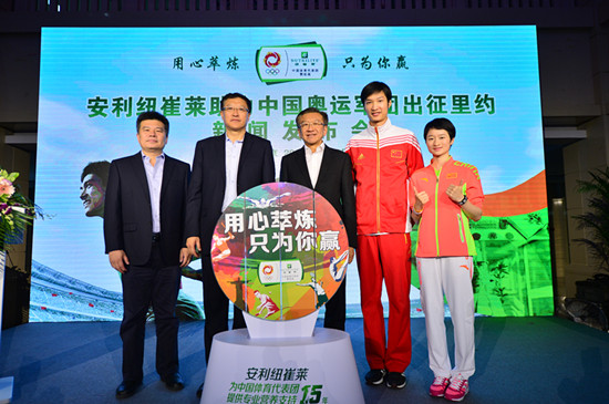 早在2000年,安利纽崔莱即已成为中国体育代表团官方营养保健食品。15年来,安利纽崔莱依托安全优质的全线产品及在营养补充领域的全球科研成果,为中国奥运军团提供专业营养支持。中国奥委会市场开发部主任李桦、副主任王明晏,安利(中国)总裁黄德荫,两届奥运冠军、女子跆拳道选手吴静钰,奥运冠军、击剑运动员雷声等出席了发布会。活动由央视著名体育主持人张斌主持。