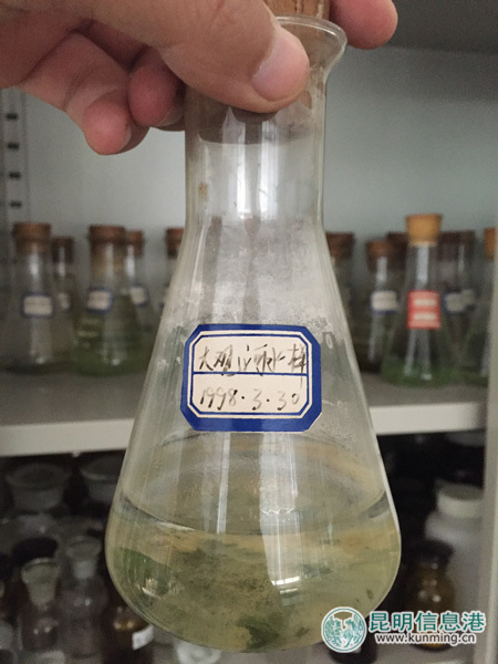 49份水样中有38份是大观河水样,11份盘龙江水样。由于密封较好,没有光线直射,只有2份大观河水样干涸。而大部分保存的水样都已长出了水藻,水样的颜色也起了变化,青绿色、褐红色、淡绿色……但水质从外观上看尚还清澈。三角瓶上还贴着依稀可辨的取样时间、河道名称、具体地点等信息。