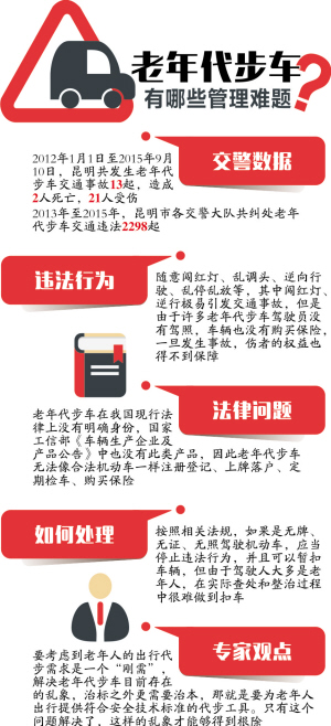 市民担忧老年代步车安全性能的背后,确实有一组触目惊心的数字做支撑。昆明市公安局交警支队提供的数据显示,2012年1月1日至2015年9月10日,昆明共发生老年代步车交通事故13起,造成2人死亡,21人受伤;2013年至2015年,昆明市各交警大队共纠处老年代步车交通违法2298起。
