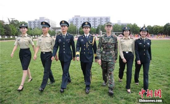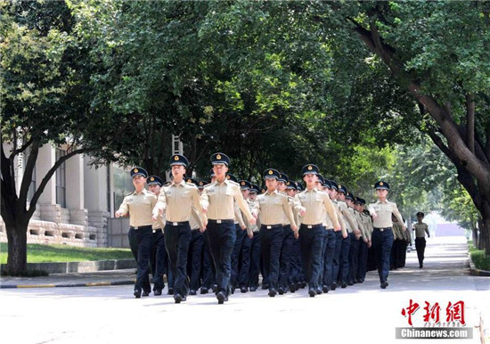 经中央军委批准,在建党95周年和战略导弹部队组建50周年纪念日,火箭军官兵启用穿着新式礼(常)服。据了解,火箭军礼(常)服颜色采用墨绿色搭配卡其色,礼服、春秋常服、冬常服、夏常服裤、大衣等为墨绿色,与火箭军主战装备的外观颜色相近;衬衣和长(短)袖夏常服上衣为卡其色,与其他军种服装颜色区别明显。图为学员们迈着整齐步伐走向课堂。 中新社发 冯根锁 摄
