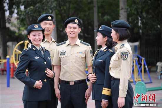 经中央军委批准,在建党95周年和战略导弹部队组建50周年纪念日,火箭军官兵启用穿着新式礼(常)服。据了解,火箭军礼(常)服颜色采用墨绿色搭配卡其色,礼服、春秋常服、冬常服、夏常服裤、大衣等为墨绿色,与火箭军主战装备的外观颜色相近;衬衣和长(短)袖夏常服上衣为卡其色,与其他军种服装颜色区别明显。图为官兵们穿上新军装。 中新社发 陈双维 摄
