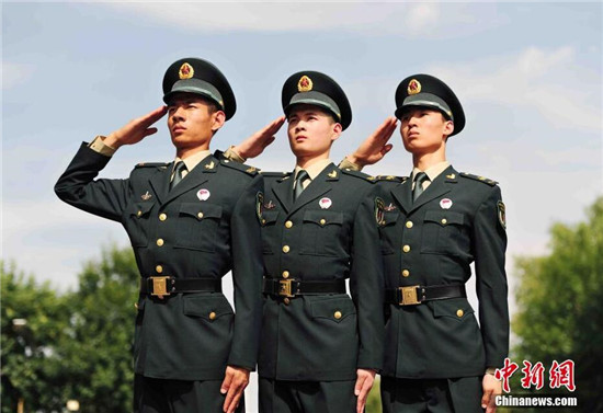 经中央军委批准,在建党95周年和战略导弹部队组建50周年纪念日,火箭军官兵启用穿着新式礼(常)服。据了解,火箭军礼(常)服颜色采用墨绿色搭配卡其色,礼服、春秋常服、冬常服、夏常服裤、大衣等为墨绿色,与火箭军主战装备的外观颜色相近;衬衣和长(短)袖夏常服上衣为卡其色,与其他军种服装颜色区别明显。图为新军服,新面貌。 中新社发 冯根锁 摄
