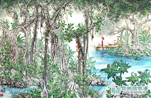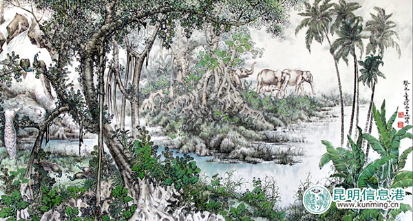 赵云昆为创作《有一个美丽的地方》(西双版纳风情系列)曾十多次深入雨林、澜沧江边、傣家村落等地进行实地写生,他深深迷恋着这片美丽神秘的土地(西双版纳现也是他的第二故乡)。在欣赏他创作的一幅幅描绘美丽西双版纳热带雨林美若仙境的画面时,扑面而来的是那芬芳花香与幽深静谧的林荫,是飞瀑和弦与泉水幽旋,此时我们似乎早也是置身其间!画面中还不时传来孔雀在鸣唱、那吉象踏歌而来、白鹭在双双低语……所有一切是那样的美妙、唯美、和谐,让人向往,梦一样的美,情一样的深,这如情似梦画面就是赵云昆笔下西双版纳那美丽的天和秘林。