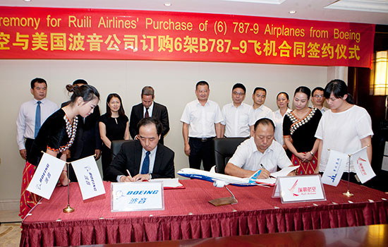 昆明信息港讯 记者上官艳君 7月11日,瑞丽航空与美国波音公司在云南省瑞丽市景成地海温泉度假中心正式签署6架波音787-9飞机订购合同。