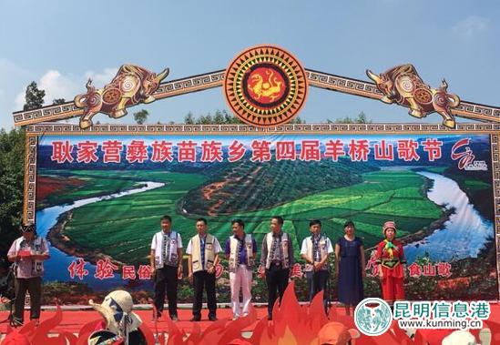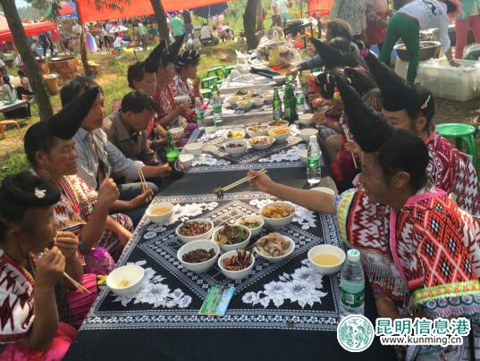 昆明信息港讯 记者杨炎 7月26日,昆明市宜良县耿家营彝族苗族乡第四届羊桥山歌节精彩上演,游客与村民一起唱起山歌庆祝彝族传统节日,活动还准备了800桌地道的彝族特色长街宴美食,食材全部取自耿家营乡本地,本地喂养的牛和羊、生态放养的土鸡、正宗的土鸡蛋,吸引了数万游客与村民一起品尝美食长街宴。