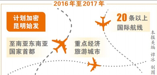 在加密航线方面,2016年至2017年,计划加密昆明始发至南亚东南亚国家首都、重点经济和旅游城市等国际航线20条以上。
